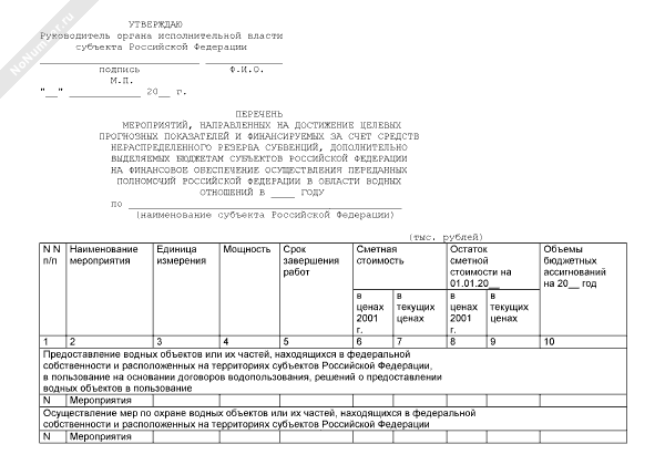 - 501Перечень мероприятий, направленных на достижение целевых прогнозных показателей и финансируемых за счет средств нераспределенного резерва субвенций, дополнительно выделяемых бюджетам субъектов Российской Федерации на финансовое обеспечение осуществления переданных полномочий Российской Федерации в области водных отношений