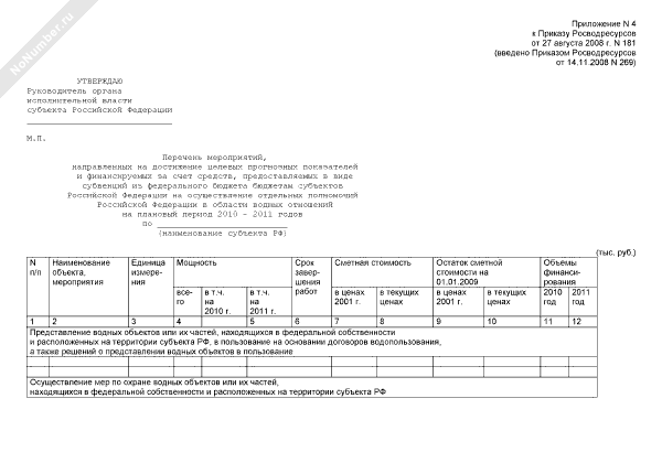 - 502Перечень мероприятий, направленных на достижение целевых прогнозных показателей и финансируемых за счет средств, предоставляемых в виде субвенций из федерального бюджета бюджетам субъектов Российской Федерации на осуществление отдельных полномочий Российской Федерации в области водных отношений на плановый период 2010–2011 годов