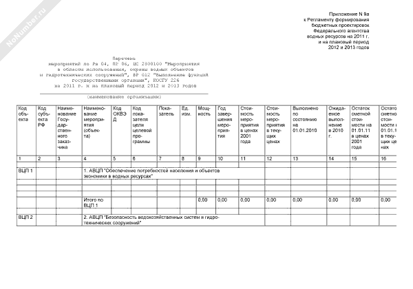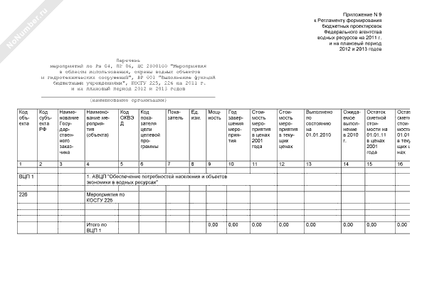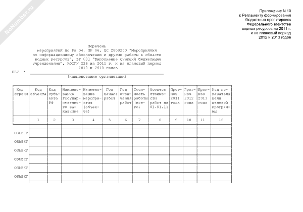 - 503Перечень мероприятий по Рз 04, ПР 06, ЦС 2800100 «Мероприятия в области использования, охраны водных объектов и гидротехнических сооружений», ВР 001 «Выполнение функций бюджетными учреждениями», КОСГУ 225, 226 на 2011 г. и на плановый период 2012 и 2013 годов