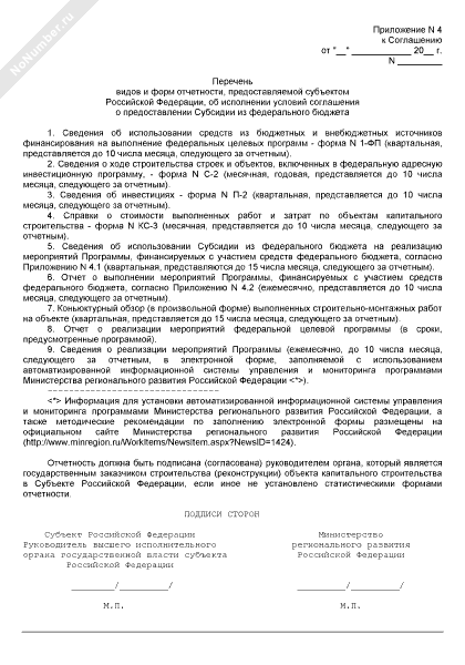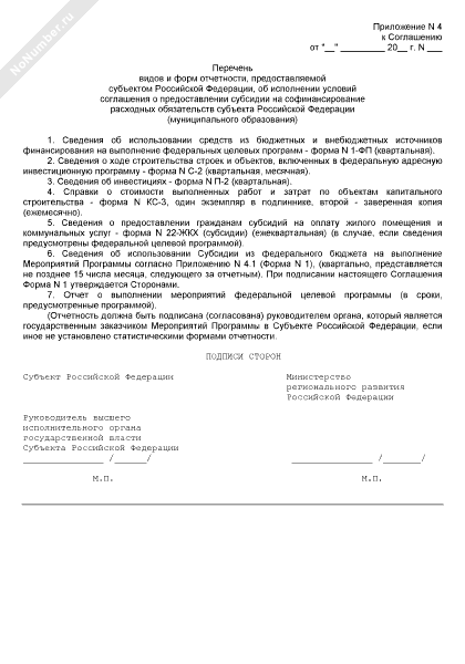 - 53Перечень видов и форм отчетности, предоставляемой субъектом Российской Федерации, об исполнении условий соглашения о предоставлении субсидии на софинансирование расходных обязательств субъекта Российской Федерации (муниципального образования) (приложение к соглашению о предоставлении субсидии из федерального бюджета бюджету субъекта Российской Федерации на софинансирование расходных обязательств субъекта Российской Федерации (муниципальных образований) по реализации мероприятий федеральной целевой программы (подпрограммы))