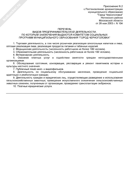 - 56Перечень видов предпринимательской деятельности, по которым заключения выдаются Комитетом социальных программ муниципального образования «Город Черноголовка» Ногинского района Московской области