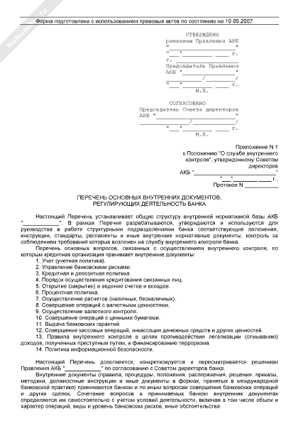 - 704Перечень основных внутренних документов, регулирующих деятельность банка (приложение к положению о службе внутреннего контроля)
