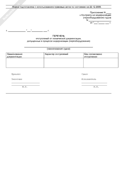 - 718Перечень отступлений от технической документации, допущенных в процессе модернизации (переоборудования) (приложение к контракту на модернизацию (переоборудование) судна)