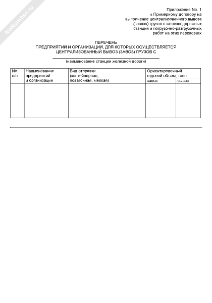 - 764Перечень предприятий и организаций, для которых осуществляется централизованный вывоз (завоз) грузов (приложение к примерному договору на выполнение централизованного вывоза (завоза) грузов с железнодорожных станций и погрузочно-разгрузочных работ на этих перевозках)