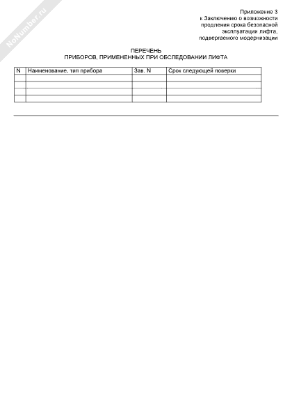 - 773Перечень приборов, примененных при обследовании лифта (приложение к заключению о возможности продления срока безопасной эксплуатации лифта)