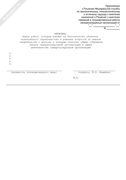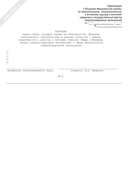 - 64Перечень видов работ, которые влияют на безопасность объектов капитального строительства и решение вопросов о выдаче свидетельств о допуске к которым отнесено общим собранием членов саморегулируемой организации к сфере деятельности саморегулируемой организации (приложение к Решению Федеральной службы по экологическому, технологическому и атомному надзору о внесении сведений в государственный реестр саморегулируемых организаций)