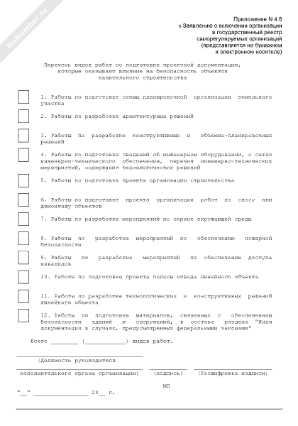 - 62Перечень видов работ по подготовке проектной документации, которые оказывают влияние на безопасность объектов капитального строительства (приложение к заявлению о включении организации в государственный реестр саморегулируемых организаций (представляется на бумажном и электронном носителе))