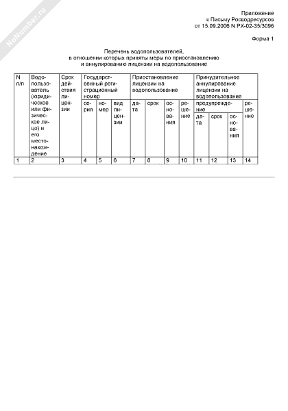 - 71Перечень водопользователей, в отношении которых приняты меры по приостановлению и аннулированию лицензии на водопользование (форма № 1)