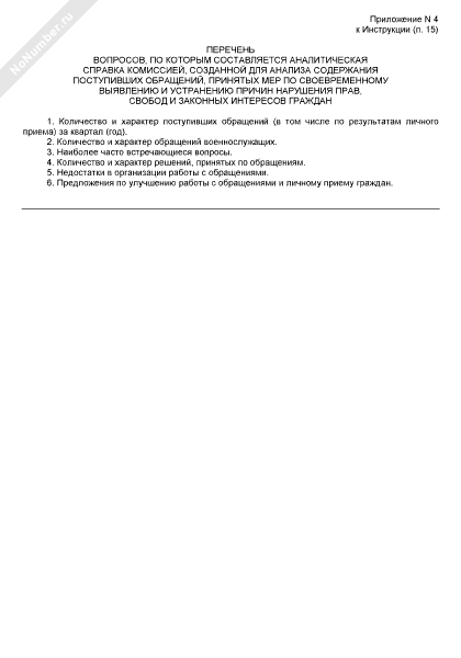 - 77Перечень вопросов, по которым составляется аналитическая справка комиссией воинской части, созданной для анализа содержания поступивших обращений, принятых мер по своевременному выявлению и устранению причин нарушения прав, свобод и законных интересов граждан