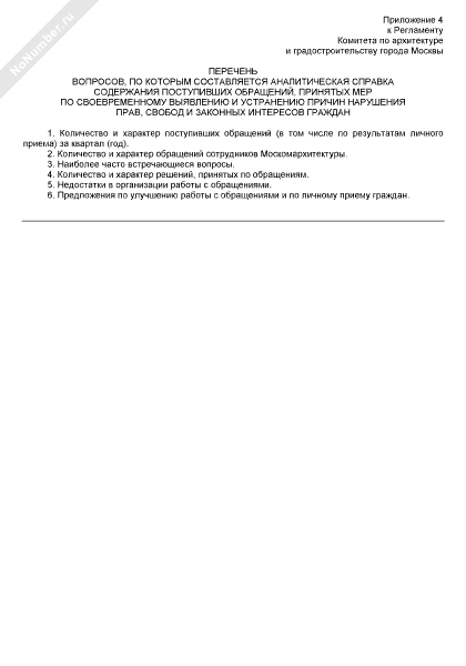 - 79Перечень вопросов, по которым составляется аналитическая справка содержания поступивших обращений в Комитет по архитектуре и градостроительству г. Москвы, принятых мер по своевременному выявлению и устранению причин нарушения прав, свобод и законных интересов граждан