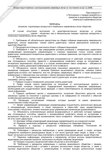 - 80Перечень вопросов, подлежащих раскрытию в локальных нормативных актах общества (приложение к положению о порядке разработки и принятия в акционерном обществе локальных нормативных актов)