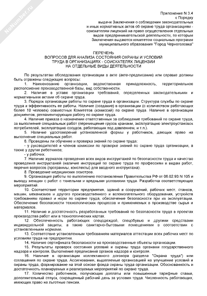 - 74Перечень вопросов для анализа состояния охраны и условий труда в организациях — соискателях лицензии на отдельные виды деятельности, по которым заключения выдаются Комитетом социальных программ муниципального образования «Город Черноголовка» Ногинского района Московской области