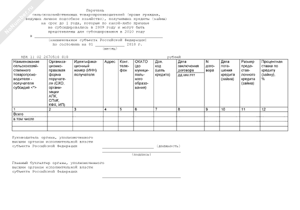 - 931Перечень сельскохозяйственных товаропроизводителей (кроме граждан, ведущих личное подсобное хозяйство), получивших кредиты (займы) на срок до 1 года, которые по какой-либо причине не субсидировались в 2009 году и могут быть представлены для субсидирования в 2010 году (приложение к отчету о расходах бюджета субъекта РФ (местного бюджета), источником финансового обеспечения которых является субсидия из федерального бюджета)