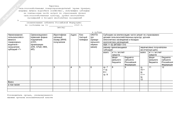 - 925Перечень сельскохозяйственных товаропроизводителей (кроме граждан, ведущих личное подсобное хозяйство), получивших субсидии на компенсацию части затрат по страхованию урожая сельскохозяйственных культур, урожая многолетних насаждений и посадок многолетних насаждений (приложение к отчету о расходах бюджета субъекта Российской Федерации (местного бюджета), источником финансового обеспечения которых является субсидия из федерального бюджета)
