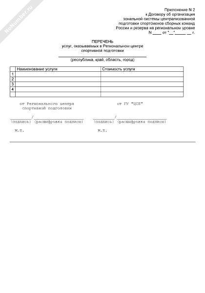 - 1006Перечень услуг, оказываемых в Региональном центре спортивной подготовки (приложение к договору об организации зональной системы централизованной подготовки спортсменов сборных команд России и резерва на региональном уровне)