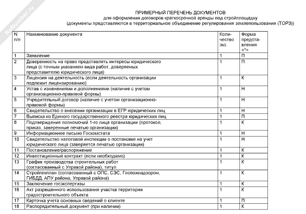 - 1138Примерный перечень документов для оформления договоров краткосрочной аренды под стройплощадку