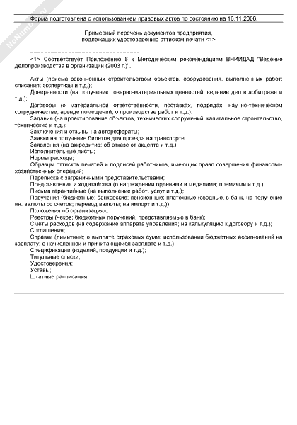 - 1137Примерный перечень документов предприятия, подлежащих удостоверению оттиском печати