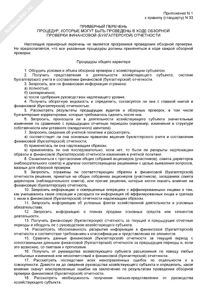 - 1126Примерный перечень процедур, которые могут быть проведены в ходе обзорной проверки финансовой (бухгалтерской) отчетности (приложение к федеральному правилу (стандарту) аудиторской деятельности «Обзорная проверка финансовой (бухгалтерской) отчетности»)