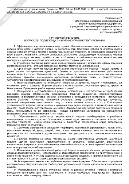 - 1131Примерный перечень вопросов, подлежащих изучению при инспектировании ведомственной охраной предприятий, учреждений