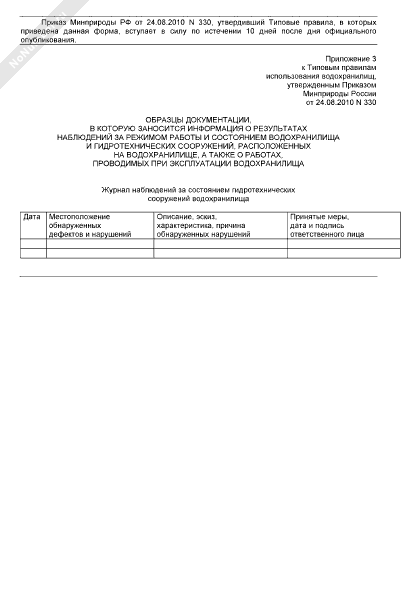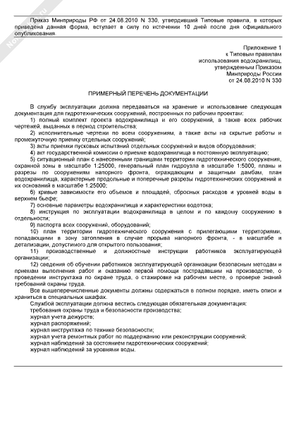 - 1152Примерный перечень документации собственника гидротехнического сооружения или эксплуатирующей организации, содержащих сведения о водохранилище, гидроузле и мерах по обеспечению безопасности гидротехнического сооружения. Журнал наблюдений за состоянием гидротехнических сооружений водохранилища