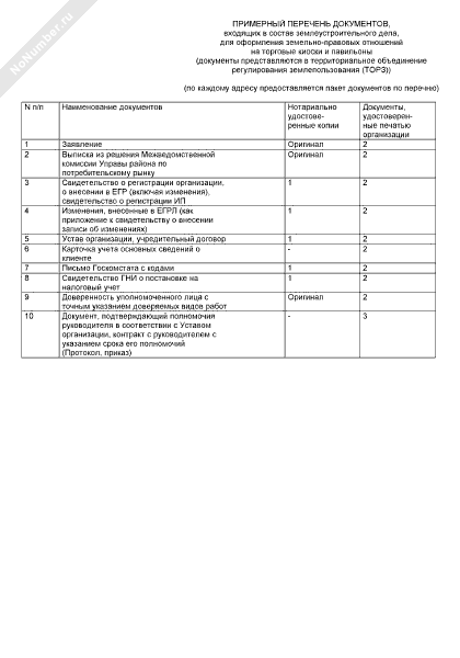 - 1141Примерный перечень документов, входящих в состав землеустроительного дела, для оформления земельно-правовых отношений на торговые киоски и павильоны