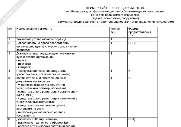 - 1142Примерный перечень документов, необходимых для оформления договора безвозмездного пользования объектом недвижимого имущества (здание, помещение, сооружение)