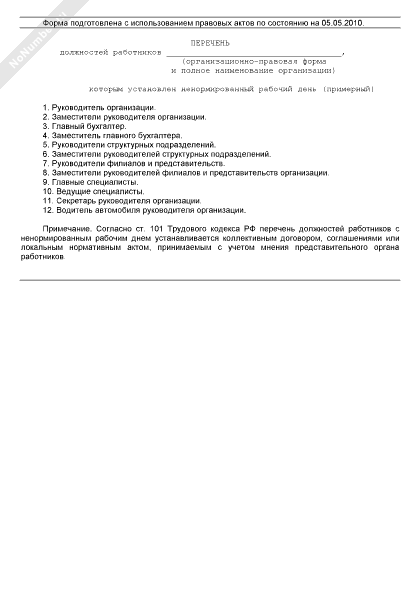 - 1150Примерный перечень должностей работников организации, которым установлен ненормированный рабочий день