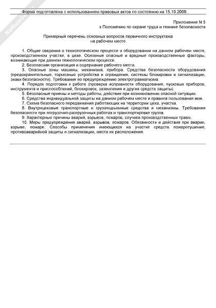 - 1148Примерный перечень основных вопросов первичного инструктажа на рабочем месте (приложение к положению по охране труда и технике безопасности)
