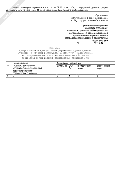 - 1182Перечень государственных и муниципальных учреждений здравоохранения субъекта, в которых реализуются мероприятия, направленные на совершенствование организации медицинской помощи пострадавшим при дорожно-транспортных происшествиях (приложение к соглашению о софинансировании расходных обязательств субъекта Российской Федерации, связанных с реализацией мероприятий, направленных на совершенствование организации медицинской помощи пострадавшим при дорожно-транспортных происшествиях)