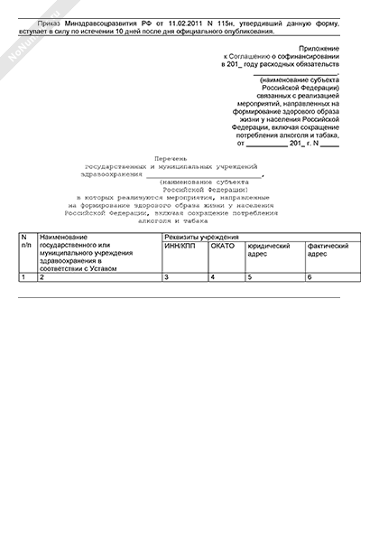 - 1181Перечень государственных и муниципальных учреждений здравоохранения субъекта Российской Федерации, в которых реализуются мероприятия, направленные на формирование здорового образа жизни у населения Российской Федерации, включая сокращение потребления алкоголя и табака (приложение к соглашению о софинансировании расходных обязательств субъекта Российской Федерации, связанных с реализацией мероприятий, направленных на формирование здорового образа жизни у населения Российской Федерации, включая сокращение потребления алкоголя и табака)