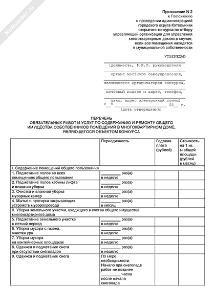- 1190Перечень обязательных работ и услуг по содержанию и ремонту общего имущества собственников помещений в многоквартирном доме, являющегося объектом конкурса по отбору управляющей организации в городском округе Котельники Московской области