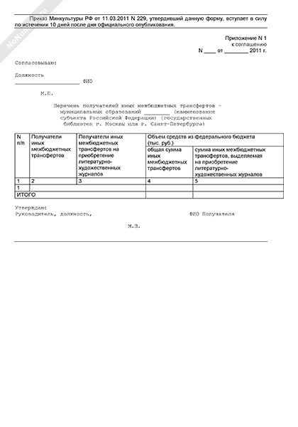 - 1193Перечень получателей иных межбюджетных трансфертов - муниципальных образований (государственных библиотек г. Москвы или г. Санкт-Петербурга) (приложение к соглашению между уполномоченным органом исполнительной власти субъекта Российской Федерации и Министерством культуры Российской Федерации о предоставлении в 2011 году из федерального бюджета бюджету субъекта Российской Федерации иных межбюджетных трансфертов на комплектование книжных фондов библиотек муниципальных образований (государственных библиотек города Москвы или города Санкт-Петербурга)