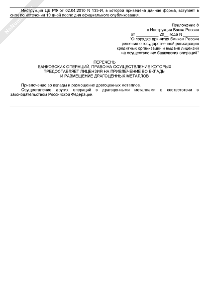Перечень банковских операций, право на осуществление которых предоставляет лицензия на привлечение во вклады и размещение драгоценных металлов (рекомендуемый образец заполнения)