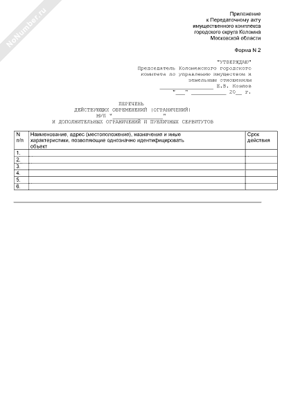 Перечень действующих обременений (ограничений) и дополнительных ограничений и публичных сервитутов (приложение к передаточному акту имущественного комплекса городского округа Коломна Московской области) (форма № 2)