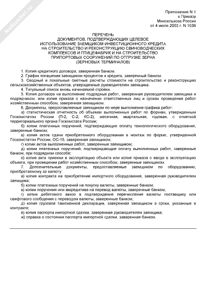 Перечень документов, подтверждающих целевое использование заемщиком инвестиционного кредита на строительство и реконструкцию свиноводческих комплексов и птицефабрик и на строительство припортовых сооружений по отгрузке зерна (зерновых терминалов)