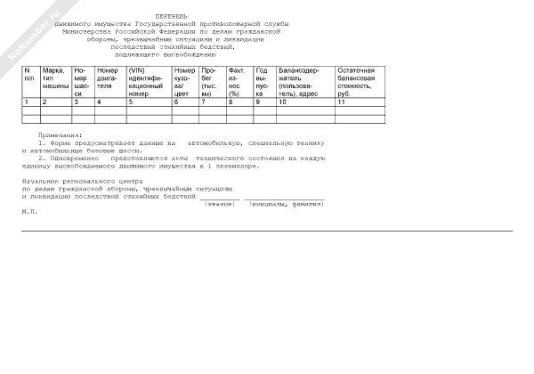 Перечень движимого имущества Государственной противопожарной службы Министерства Российской Федерации по делам гражданской обороны, чрезвычайным ситуациям и ликвидации последствий стихийных бедствий, подлежащего высвобождению (форма предусматривает данные на автомобильную, специальную технику и автомобильные базовые шасси)