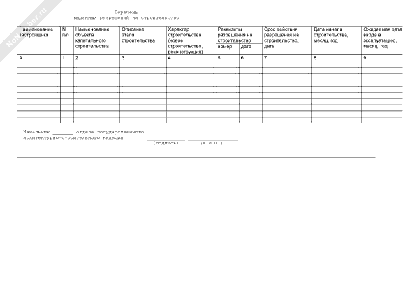 Перечень выданных разрешений на строительство (рекомендуемый образец заполнения)