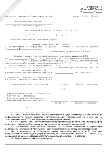 - 9Информационное письмо Федеральной налоговой службы о переходе налогоплательщика на систему налогообложения для сельскохозяйственных товаропроизводителей. Форма № 26.1-6