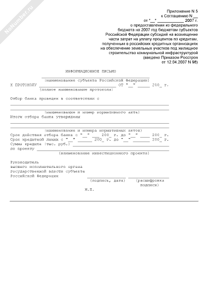 - 5Информационное письмо субъекта Российской Федерации об отборе банка (приложение к типовому соглашению о предоставлении субсидий на возмещение части затрат на уплату процентов по кредитам, полученным в российских кредитных организациях на обеспечение земельных участков под жилищное строительство коммунальной инфраструктурой)