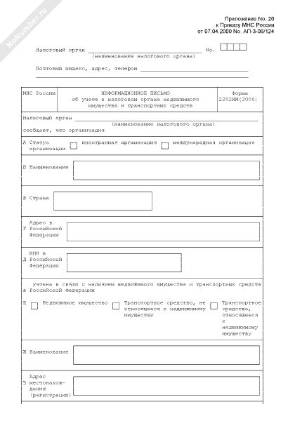 - 3Информационное письмо об учете в налоговом органе недвижимого имущества и транспортных средств. Форма № 2202ИМ(2000)