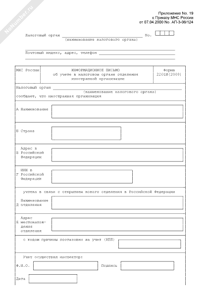 - 2Информационное письмо об учете в налоговом органе отделения иностранной организации. Форма № 2201И(2000)