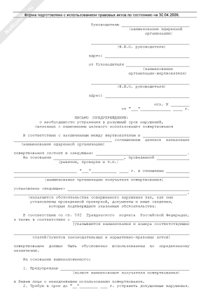 - 14Письмо (предупреждение) о необходимости устранения в разумный срок нарушений, связанных с изменением целевого использования пожертвования