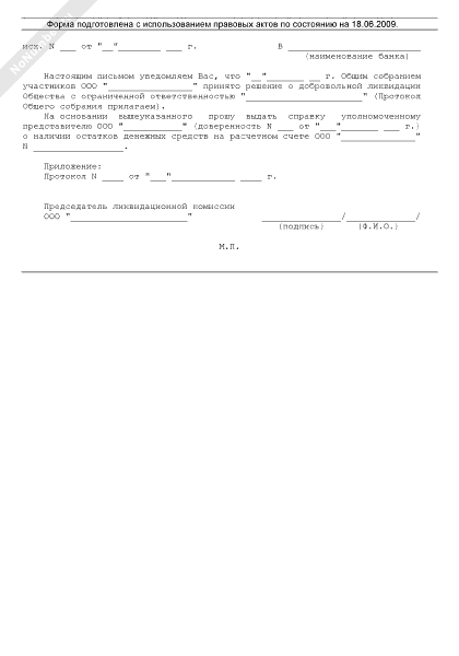- 15Письмо в банк о выдаче справки о наличии остатков денежных средств на счету ликвидируемого общества с ограниченной ответственностью