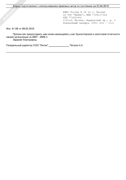 - 18Письмо в налоговую инспекцию с просьбой о предоставлении копий бухгалтерской и налоговой отчетности организации для восстановления утраченной документации