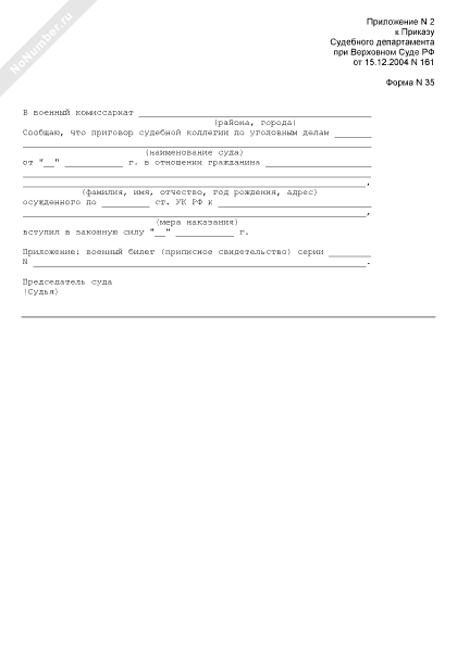 - 19Письмо в районные (городские) военные комиссариаты по месту жительства осужденного о вступивших в законную силу судебных постановлениях, в отношении осужденных военнообязанных и призывников. Форма № 35
