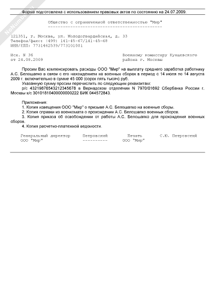 - 16Письмо в военкомат о возмещении организации затрат, связанных с выплатой работнику, призванного на военные сборы, среднего заработка