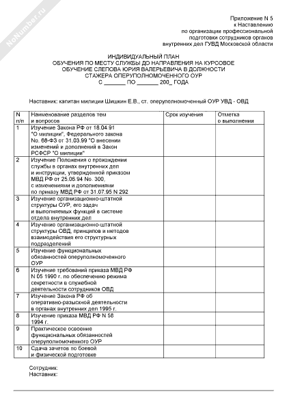 - 29Индивидуальный план обучения по месту службы до направления на курсовое обучение сотрудника в должности стажера оперуполномоченного ОУР
