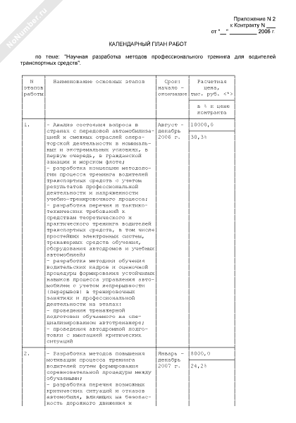 - 78Календарный план работ (приложение к государственному контракту на выполнение НИОКР (поставку готовой научно-технической продукции по теме: «Проведение научных исследований нормативно-правового и методического обеспечения системы повышения квалификации и профессионального мастерства водителей транспортных средств. Подготовка предложений по ее совершенствованию»))