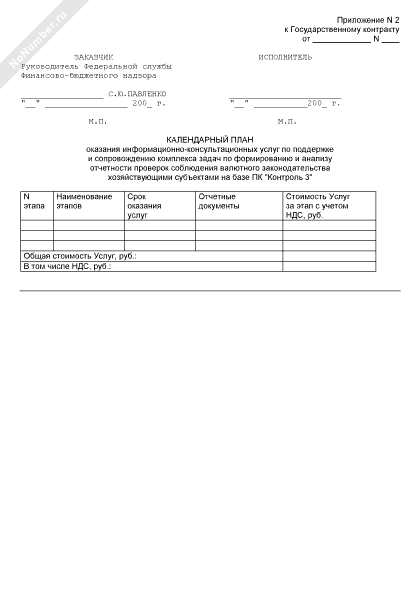 - 100Календарный план оказания информационно-консультационных услуг по поддержке и сопровождению комплекса задач по формированию и анализу отчетности проверок соблюдения валютного законодательства хозяйствующими субъектами на базе ПК «Контроль 3» (приложение к государственному контракту на оказание информационно-консультационных услуг по поддержке и сопровождению комплекса задач по формированию и анализу отчетности проверок соблюдения валютного законодательства хозяйствующими субъектами)