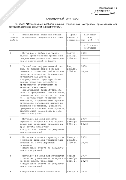 - 95Календарный план работ (приложение к государственному контракту на выполнение НИОКР (поставку готовой научно-технической продукции по теме: «Исследование проблем влияния современных материалов, применяемых для нанесения дорожной разметки, на аварийность»))